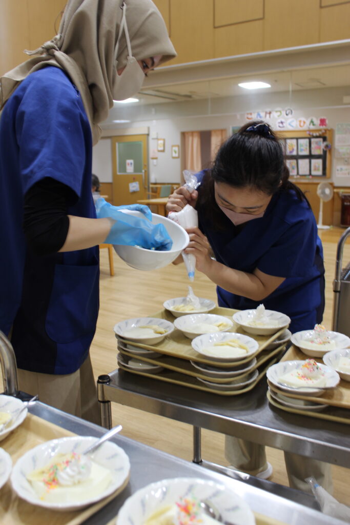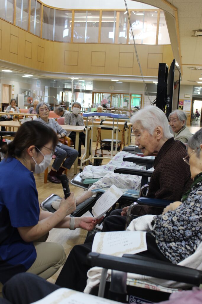 敬老会の表彰式では、皆様の笑顔がたくさん見られました。おやつは生クリームとスプレーチョコでデコレーションしたブランマンジェを召し上がりました。