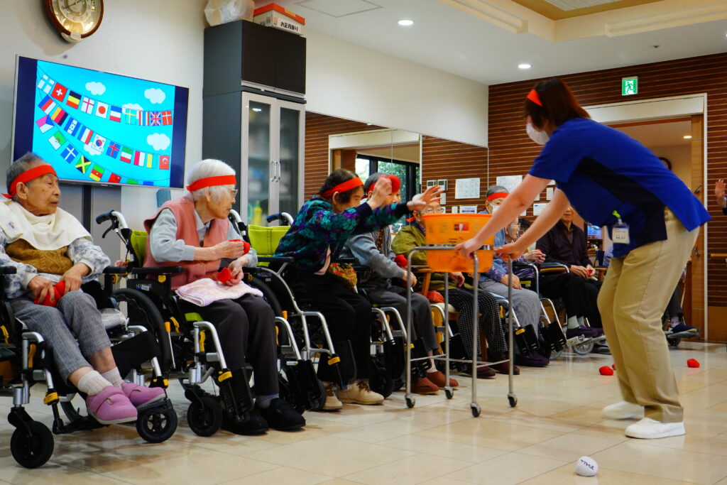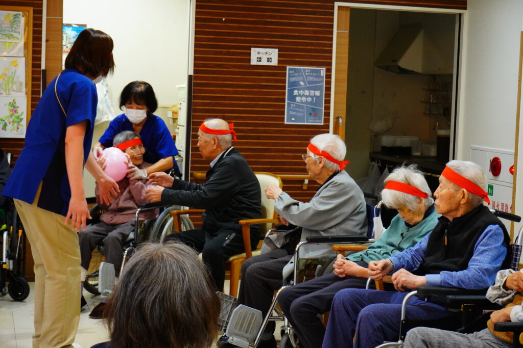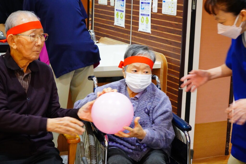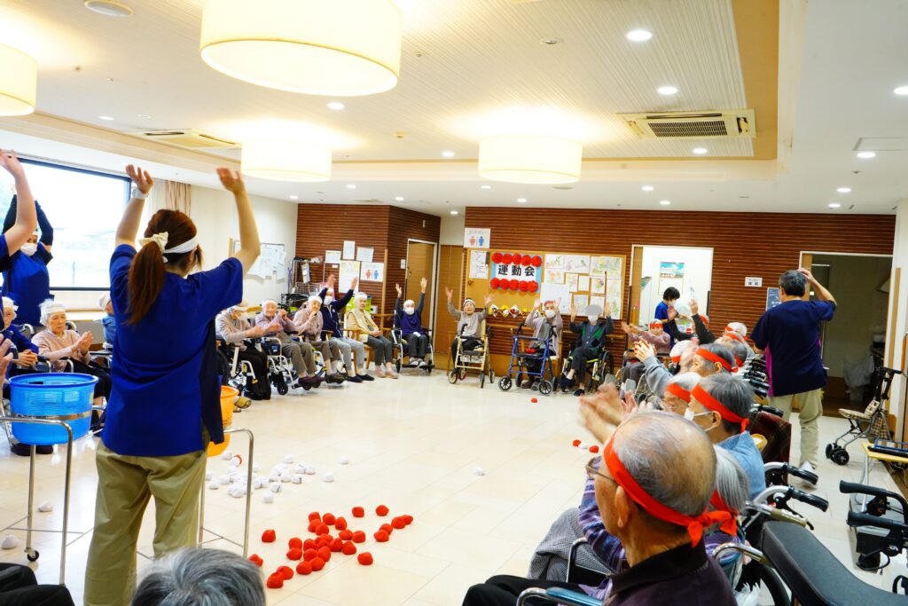 ほかほかライフでは、10月25日運動会を行いました。紅白2チームに分かれ、白熱のひととき…≪ボール運び・玉入れ≫は、皆様、勝負魂復活といったところでしょうか? とても楽しく拝見しました。最後に≪パン取り競争≫をしましたが、早くも獲得したパンをお口に運ばれた方もいて、笑いの多い運動会となりました。運動会開催の際には面会時間変更のご協力をいただきましたご家族様、感謝申し上げます。