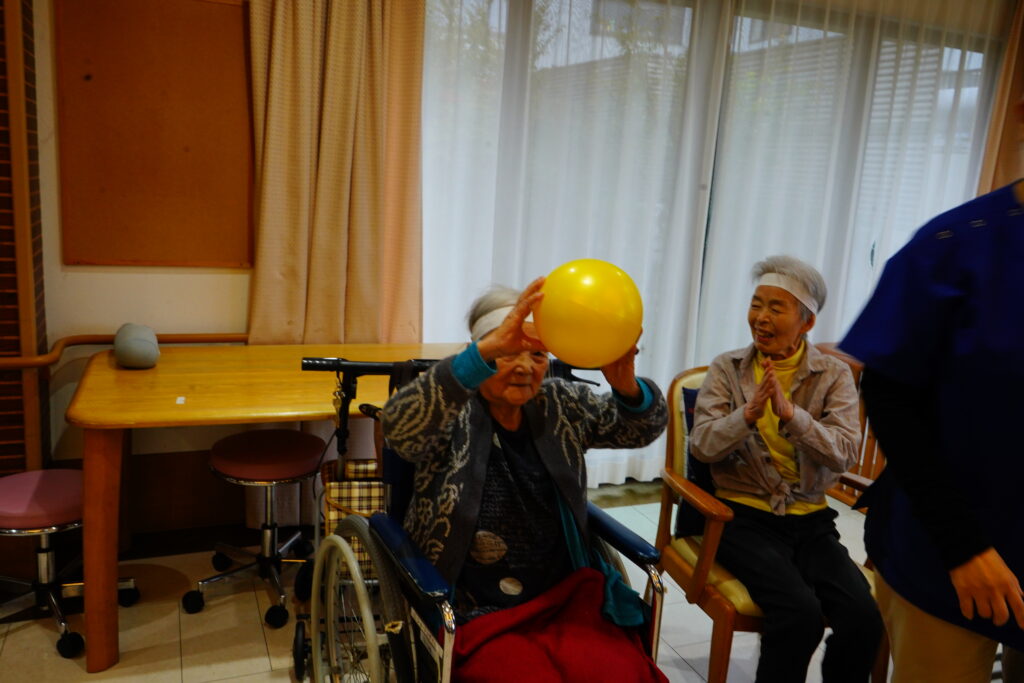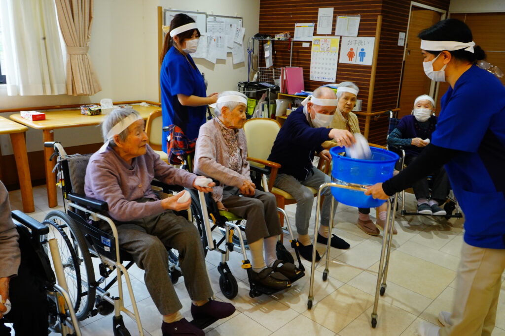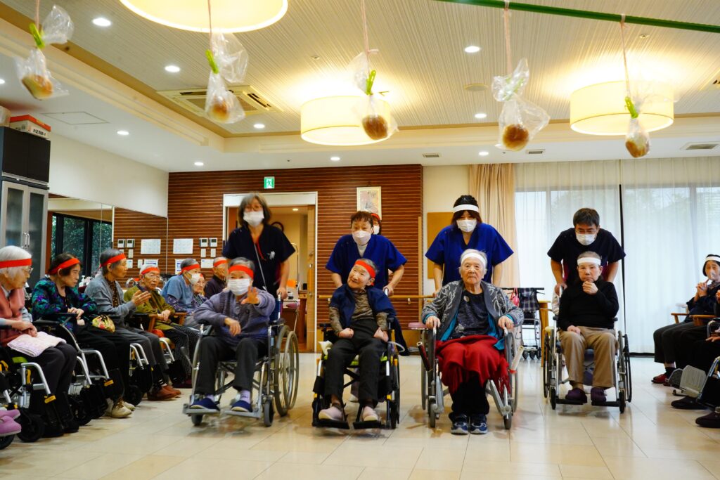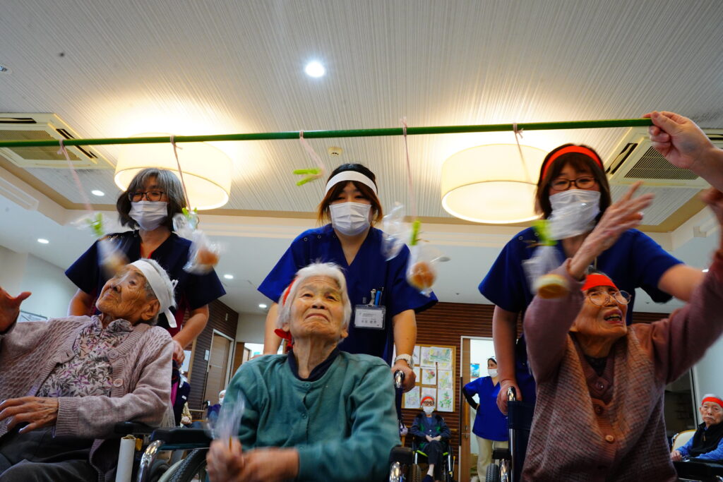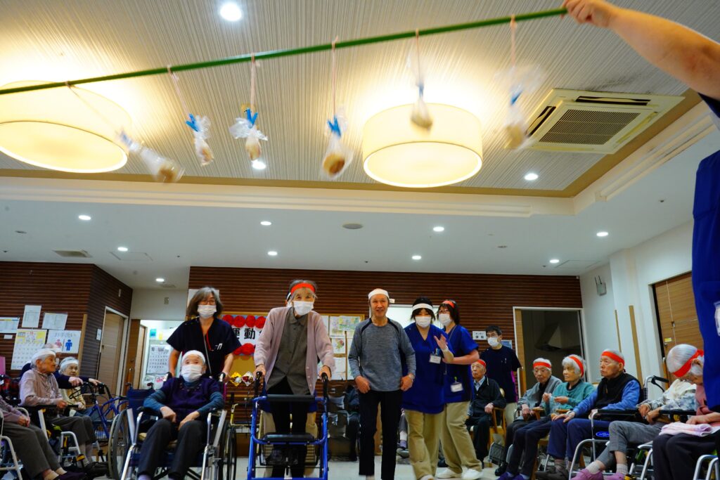 ほかほかライフでは、10月25日運動会を行いました。紅白2チームに分かれ、白熱のひととき…≪ボール運び・玉入れ≫は、皆様、勝負魂復活といったところでしょうか? とても楽しく拝見しました。最後に≪パン取り競争≫をしましたが、早くも獲得したパンをお口に運ばれた方もいて、笑いの多い運動会となりました。運動会開催の際には面会時間変更のご協力をいただきましたご家族様、感謝申し上げます。