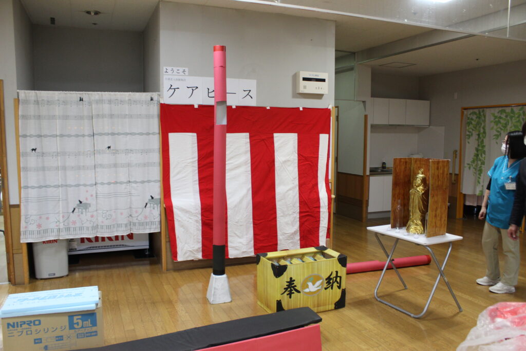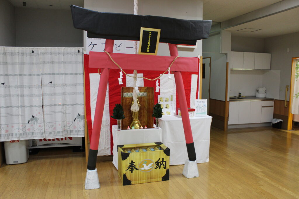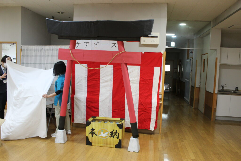 12月30日(火)、年末年始恒例の「ケアピース神社」を創建しました。寒さ厳しき中の外出が難しい状況で、入所されている皆様のために何かできることはないかと考え、毎年手作り神社を設置しています。設置場所は介護老人保健施設ケアピース1F、事務室東側になります。1月初旬頃まで設置しておりますので、ご面会の際などお立ち寄りいただければ幸いです。