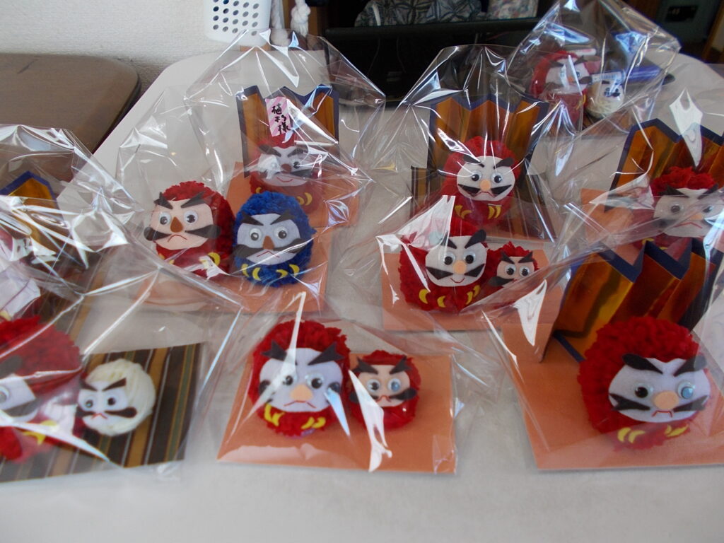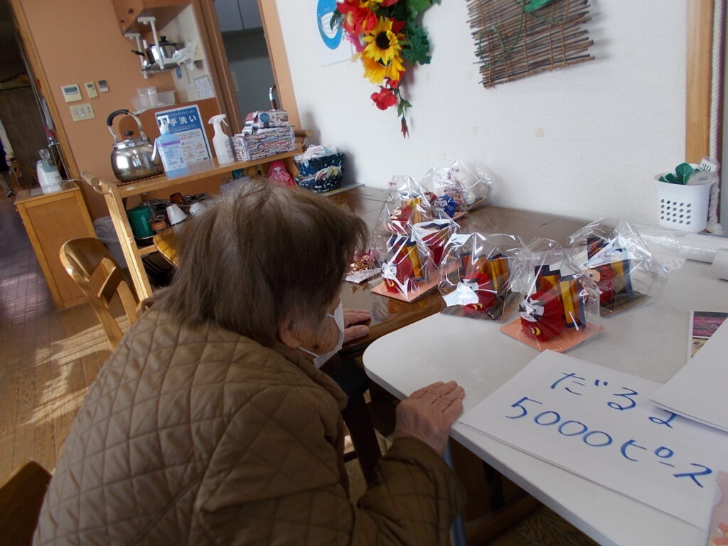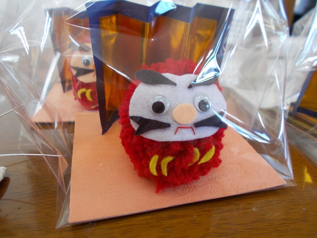 一つひとつ表情が異なるダルマとお飾りをじっくり見定め、お気に入りを見つけ、皆様がリハビリやお手伝いで頑張ったピース券と交換してお持ち帰りいただきました。