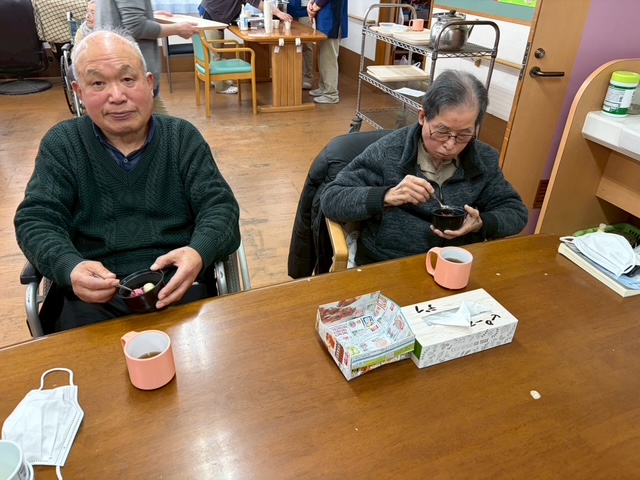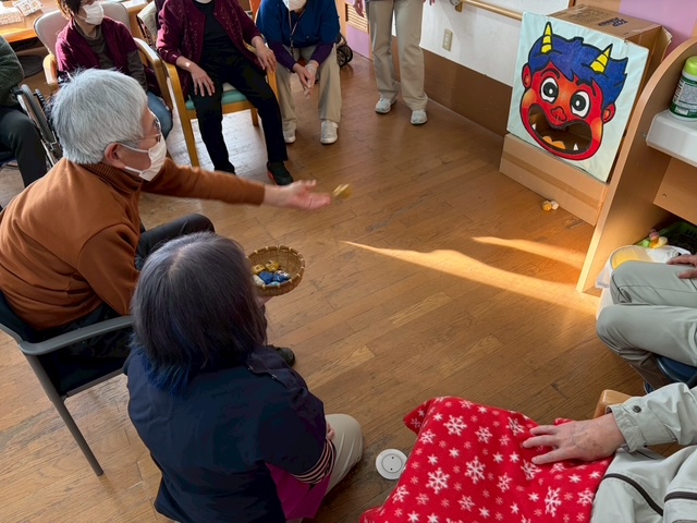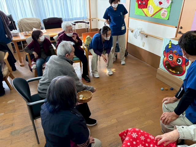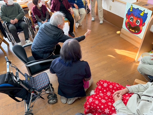 2月上旬は節分イベントを行いました。椅子に座ったまま楽しめる鬼退治ゲームは、一体感を感じられるレクリエーションで、場の雰囲気が一気に明るくなりました。皆様の大きな掛け声で厄払いできたのではないでしょうか。