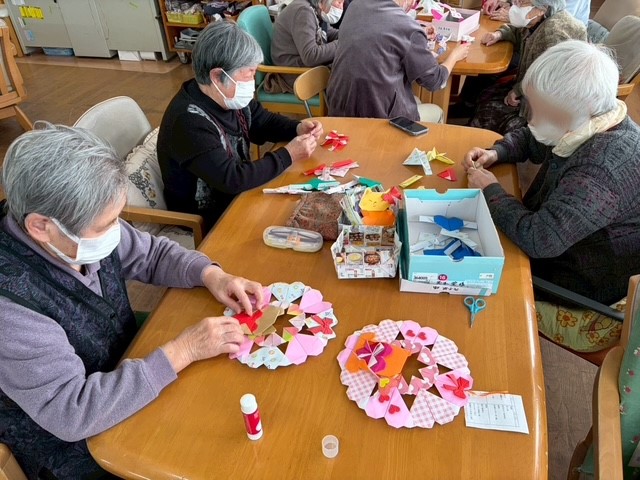 ピース安中デイサービスの制作クラブでは、職員がアイデアを持ち寄り、毎月季節感のある作品に取り組んでいます。今月はバレンタインデーに向けて、ハートとリボンのおしゃれでかわいらしい飾りを作りました。手先や頭を使う制作は、脳のトレーニングになり、認知症予防が期待できます。また、このようなレクリエーション活動が日常生活に生きがいをもたらし、心の健康にも繋がることと思います。