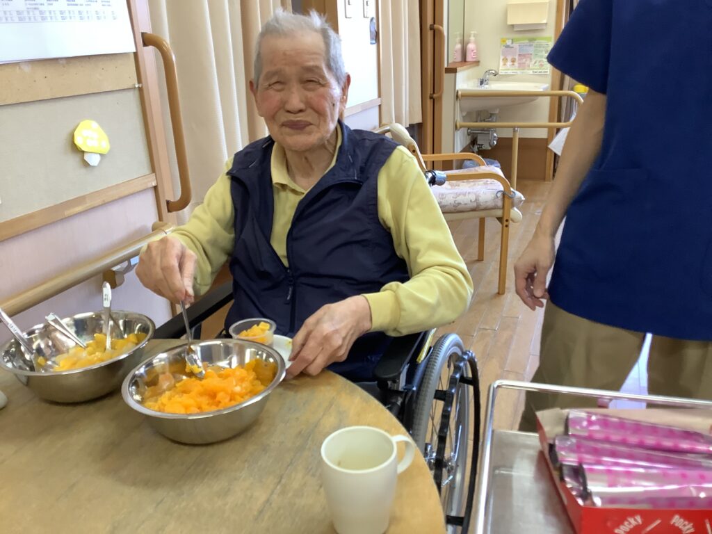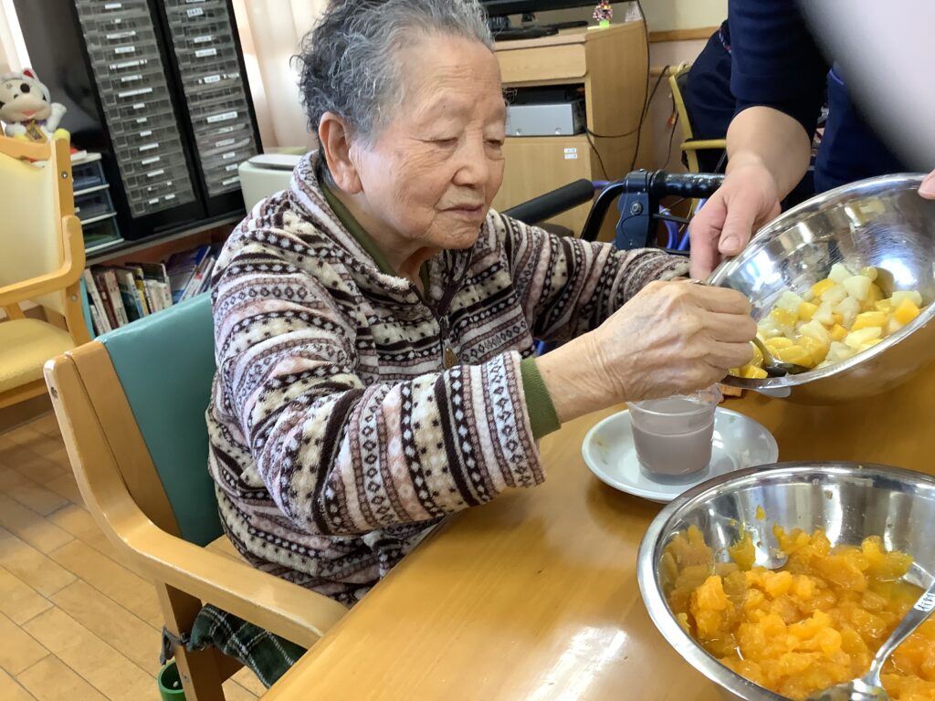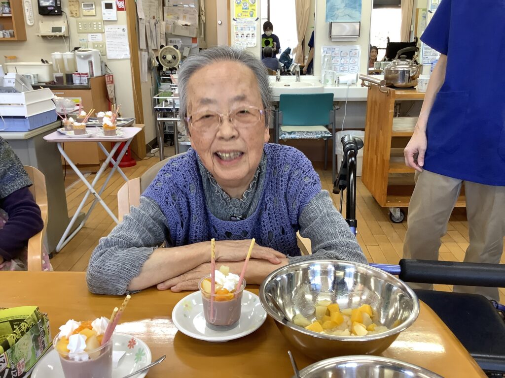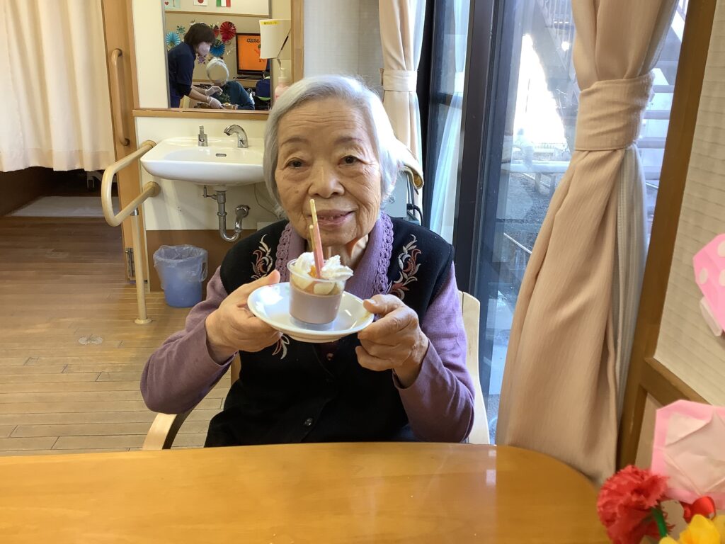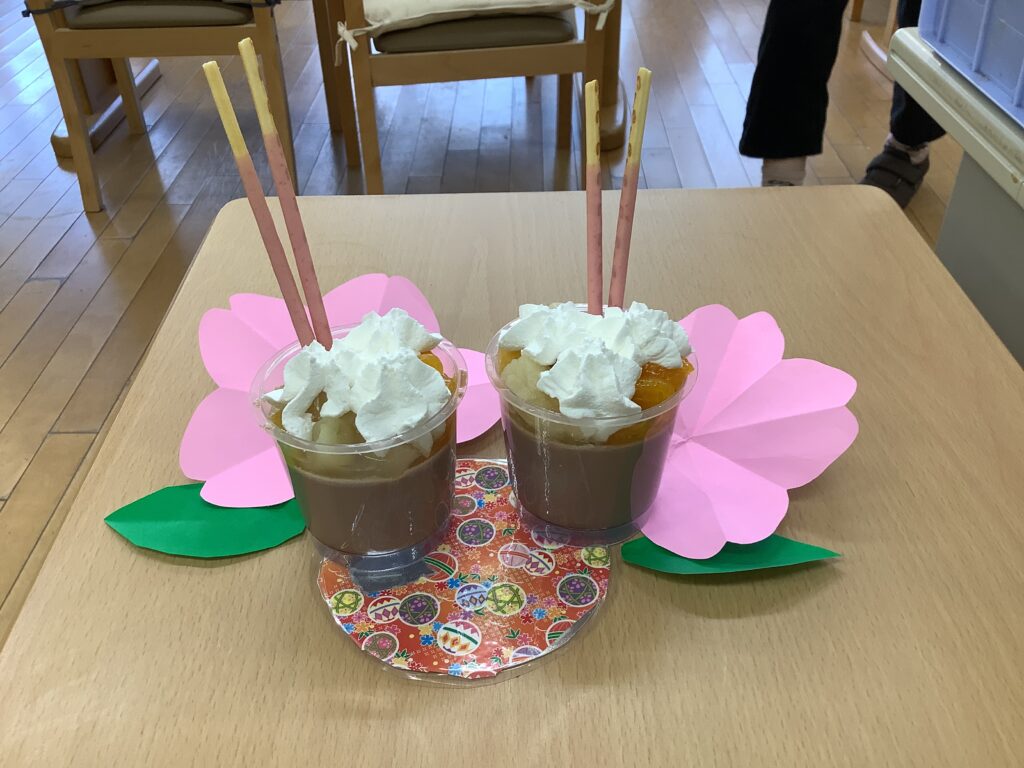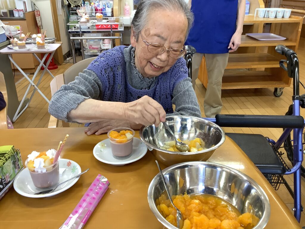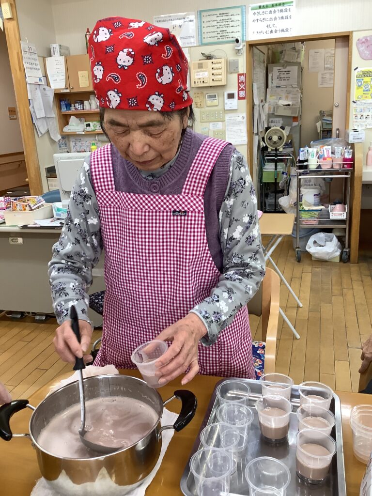 2月19日(木)、バレンタインデーのイベントを開催しました。毎日頑張っているご自分へのご褒美として、チョコレートプリンを作り、お召し上がりになりました。「自分で食べるものは自分で作りたい!」とのご希望があり、フルーツやお菓子、生クリームをトッピングして世界にひとつの手作りプリンが出来上がりました。
