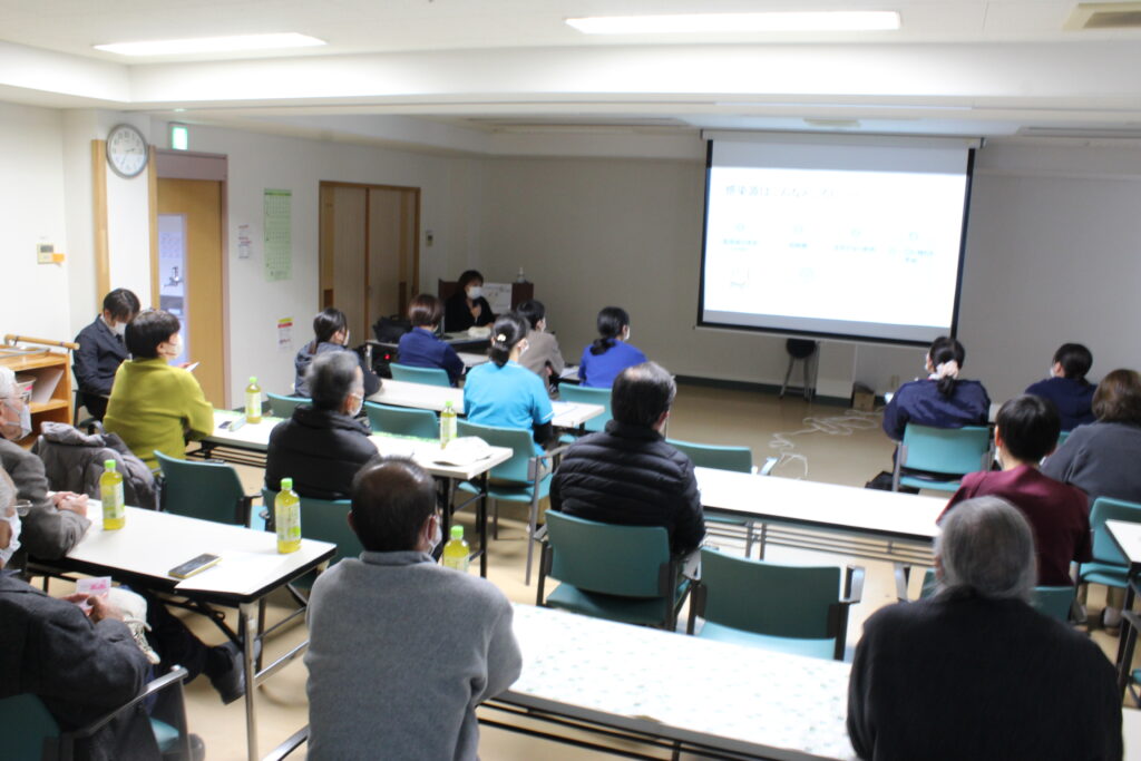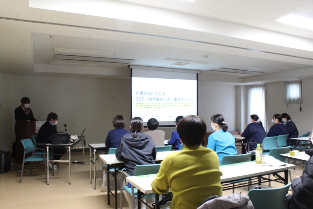 2月25日(水)、介護老人保健施設ケアピースでは、全職員の他、地域住民の皆様・入所者様ご家族を対象にBCP講演会を開催しました。今回は2テーマ『介護現場におけるBCPの重要ポイント』と『介護現場における感染症対策』についての講演となりました。災害時における地域住民の皆様との関わり方、BCPの取り組みについて等、防災に関わる交流を深める機会となり、ご参加いただきました方には心より御礼申し上げます。