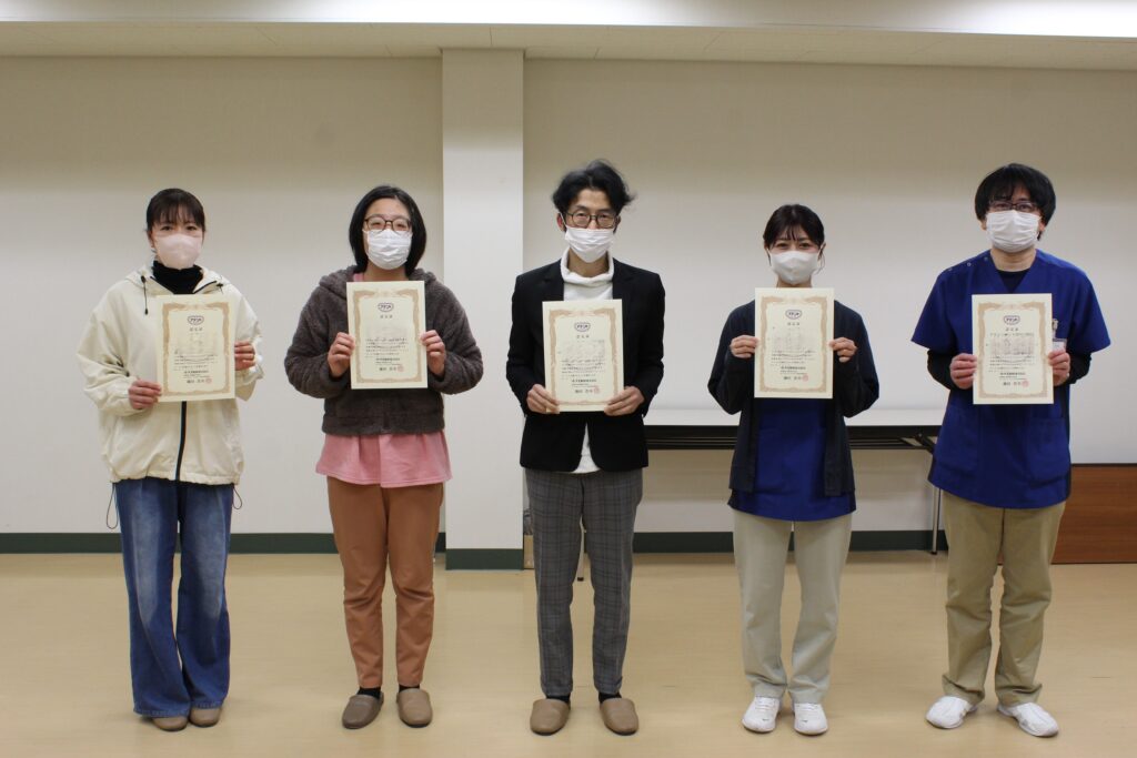 アテントマイスター・プロとは、大王製紙が提供する認定資格です。紙オムツの選び方・あて方、排泄のメカニズム、スキンケア等、幅広い知識と技術を習得し、施設内における排泄ケアについてアドバイスができる、紙オムツのプロフェッショナルです。3月6日(金)、全6回の研修を受講し、筆記・実技試験に合格した職員の修了式を行いました。資格取得後は、紙オムツの適切な使い方や排泄についてのアドバイス・提案・サポートを行います。また、紙オムツを使用している利用者様が快適にお過ごしいただけるよう、排泄ケアに幅広く活かしてまいります。