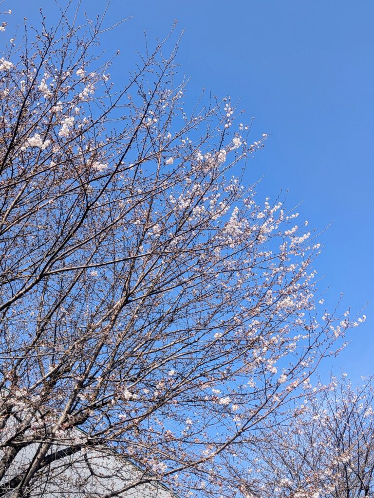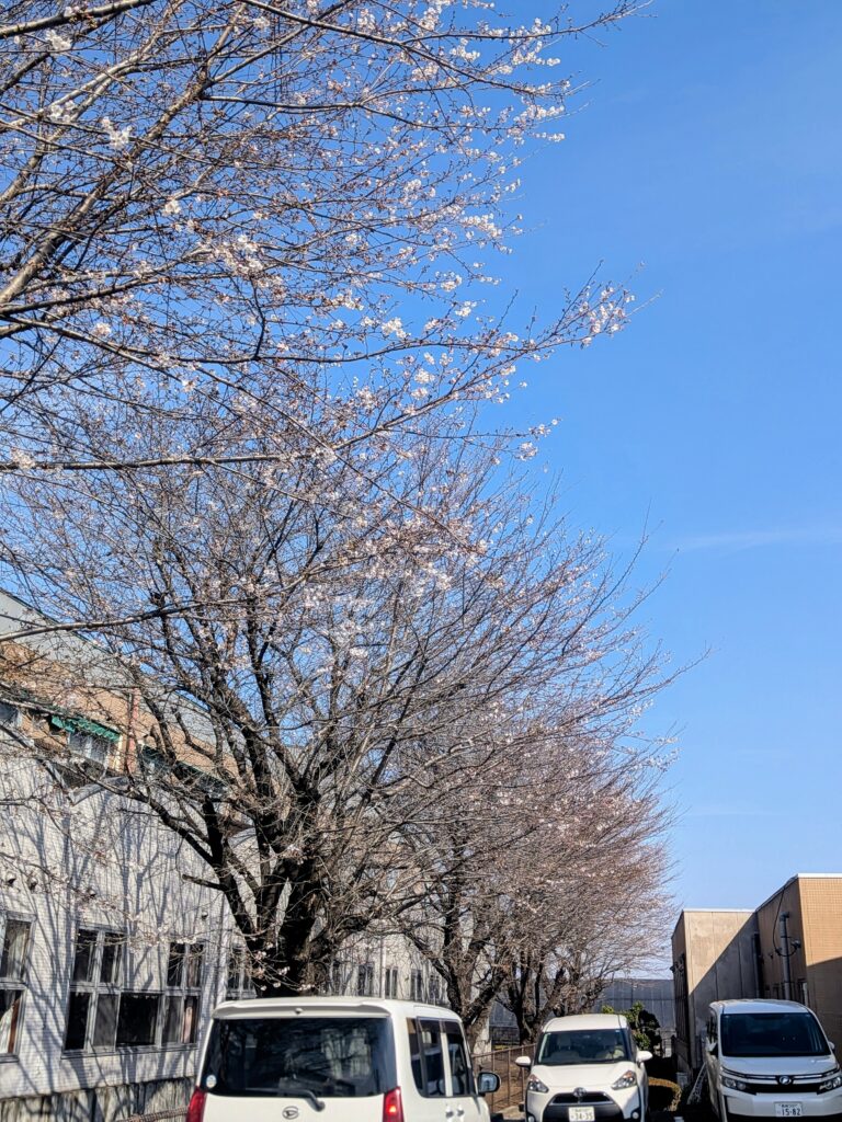 ケアピース南側のソメイヨシノが開花しました。日中は暖かく穏やかな日が続いており、満開までにそれほど時間がかからないかもしれません。ぜひお出かけください。