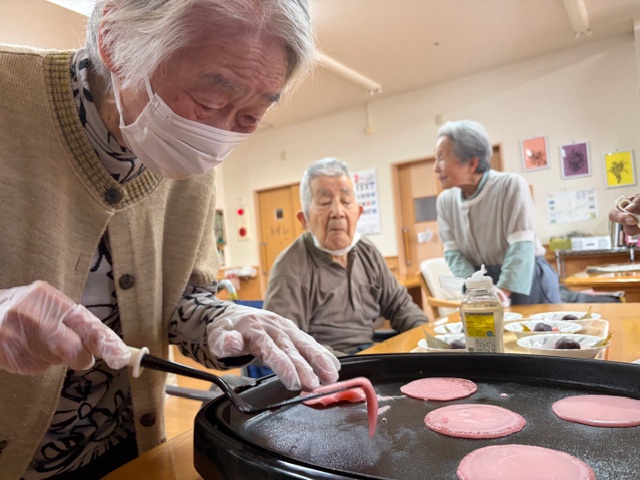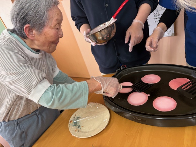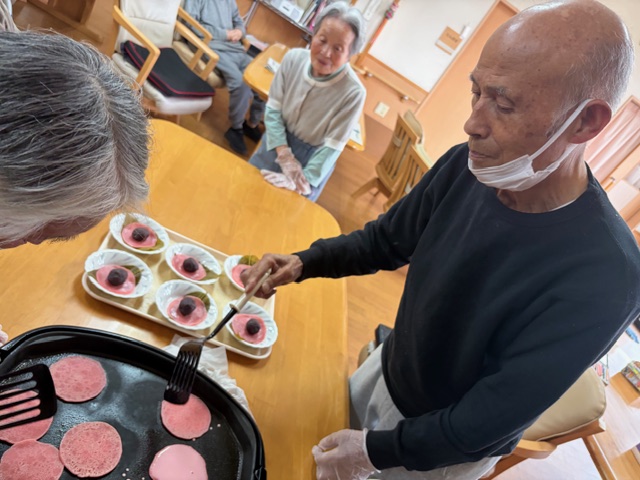 ケアステーションピース安中ショートステイでは、桜餅づくりを行いました。桜色の生地をホットプレートで焼き、甘いあんこを生地で包み、最後に塩漬けの桜の葉に包み完成です。利用者様にもお手伝いいただき、楽しく作ることができました。春を感じながら桜餅を召し上がった利用者様が温かい笑顔に。また楽しいレクリエーションの計画を検討いたします。