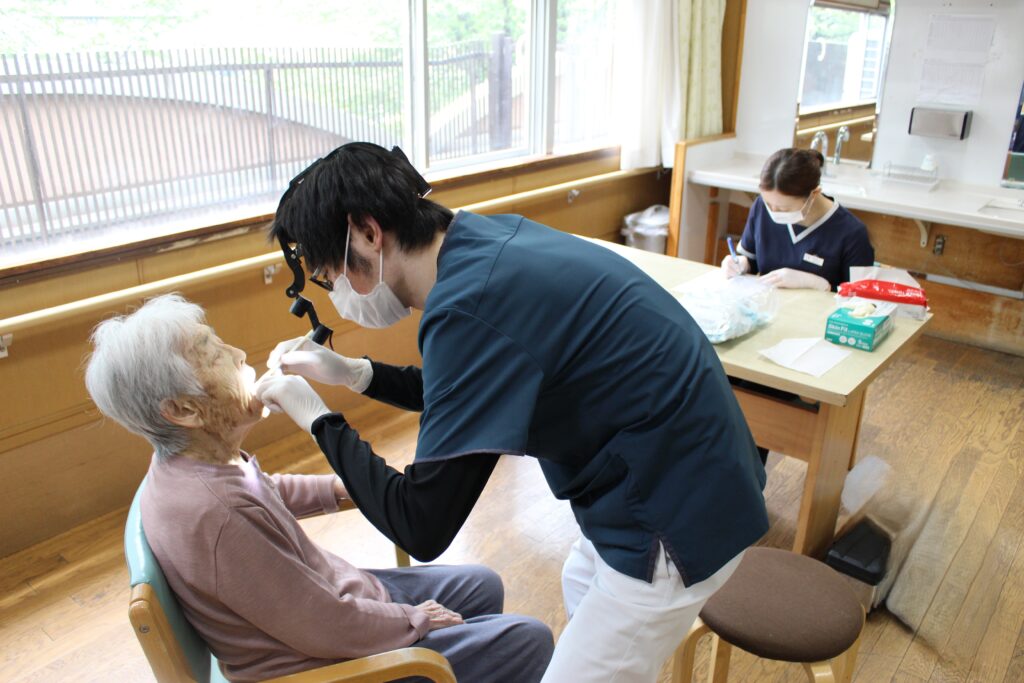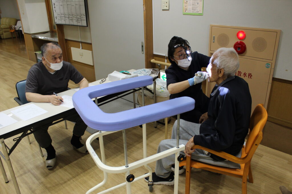 4月23日(木)、協力歯科医である【ひろかみ歯科医院】の廣神院長先生による歯科健診を行いました。高齢者の歯科検診は、歯・歯肉の状態や口腔内の衛生状態に問題がある方や、口腔機能低下の恐れがある方をスクリーニングし、詳しい検査や治療につなげることで、口腔機能の維持・向上、全身疾患の予防等を実現することを目的として実施しています。
